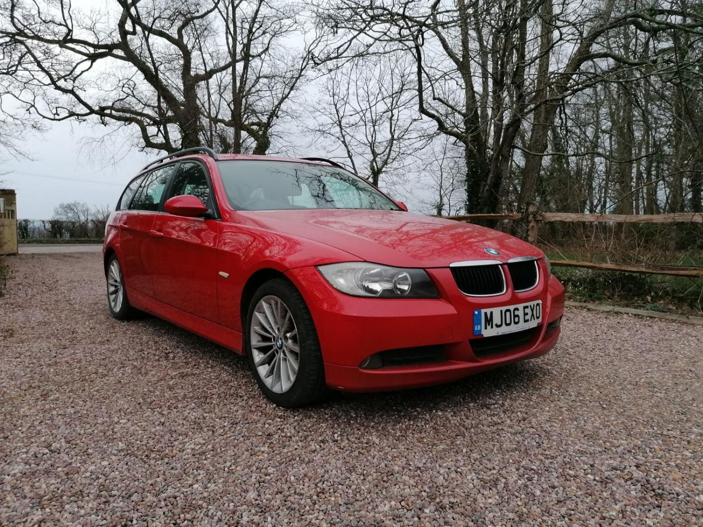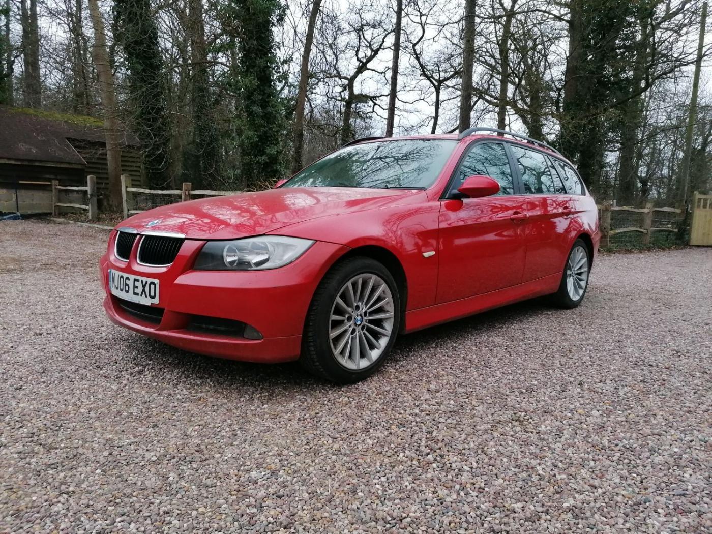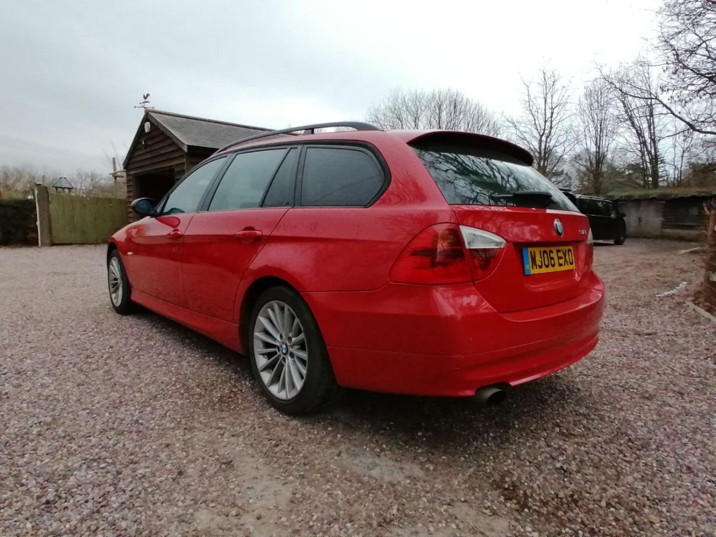2006 BMW 318I SE Touring with the N46 1.8 4 cylinder petrol engine and wonderfully smooth automatic gearbox. This petrol engine has covered 117300 miles and is wearing Japan Red metallic paint on 18 inch alloy wheels. The interior is black cloth seats. The rear windows also have factory sun blinds.