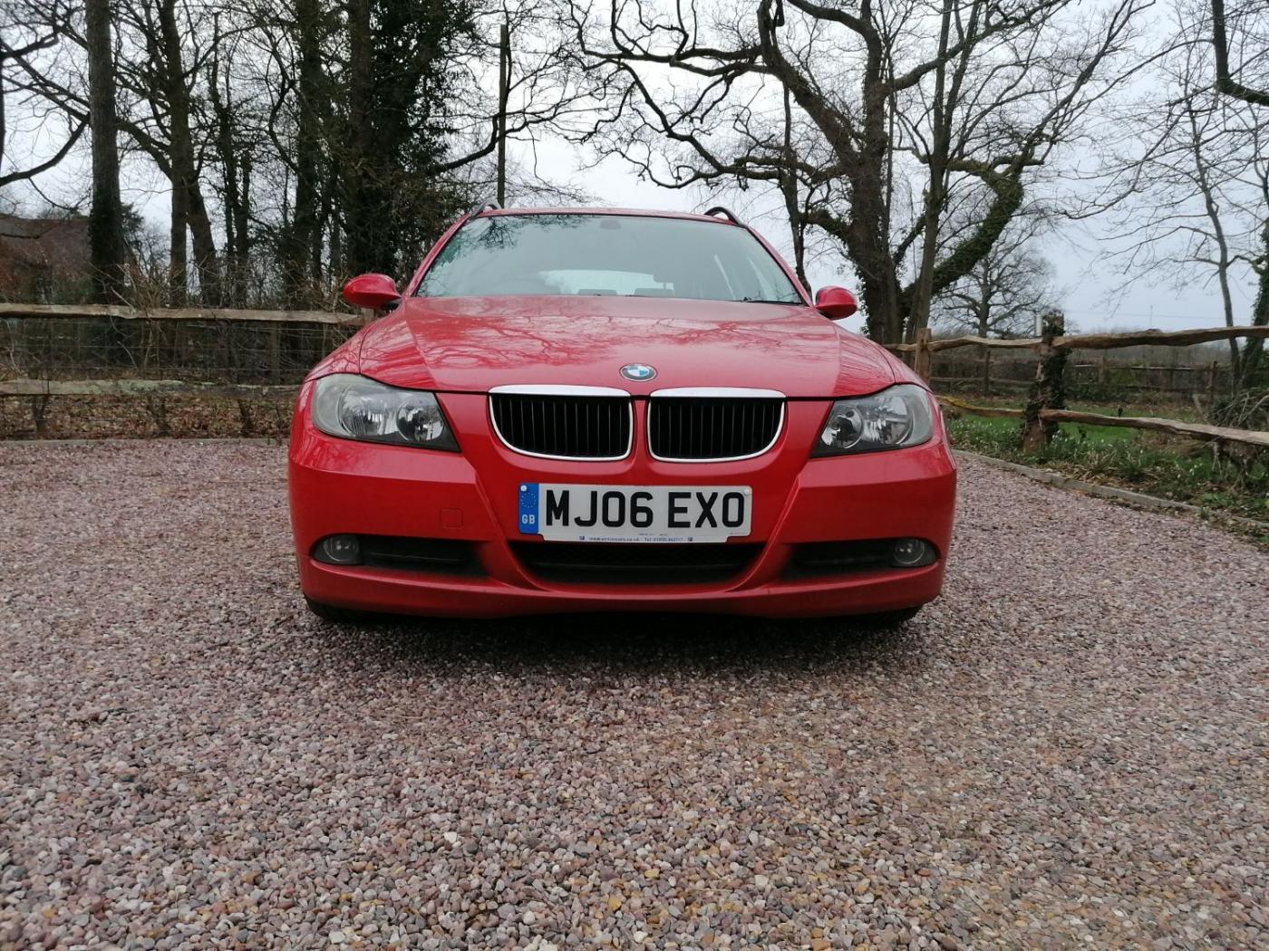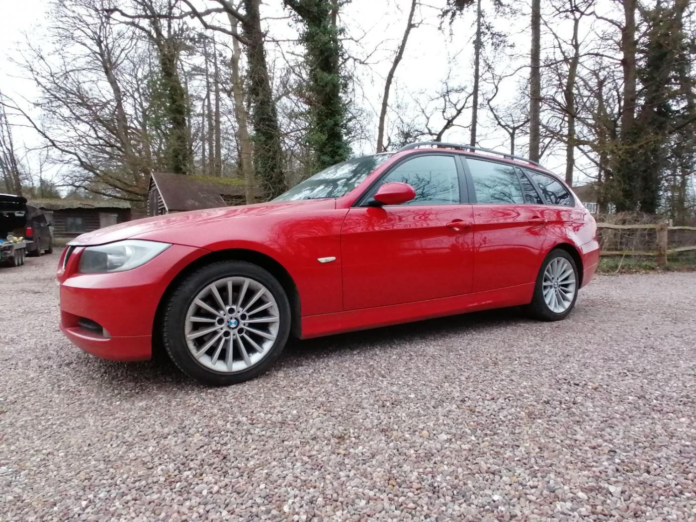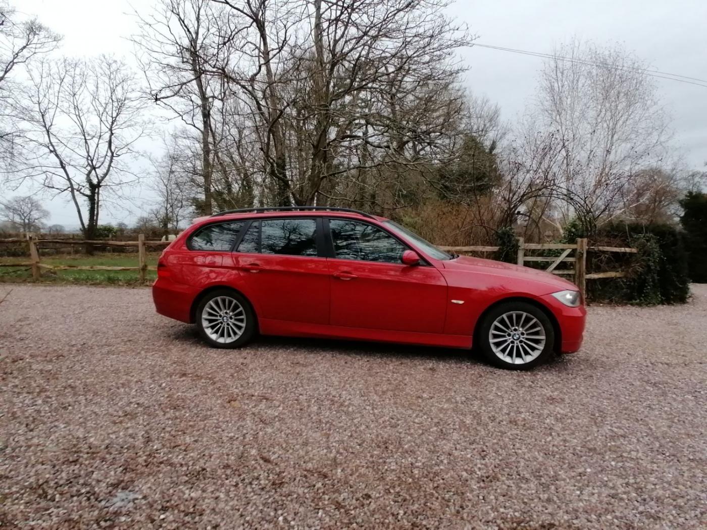 2006 BMW 318I SE Touring with the N46 1.8 4 cylinder petrol engine and wonderfully smooth automatic gearbox. This petrol engine has covered 117300 miles and is wearing Japan Red metallic paint on 18 inch alloy wheels. The interior is black cloth seats. The rear windows also have factory sun blinds.