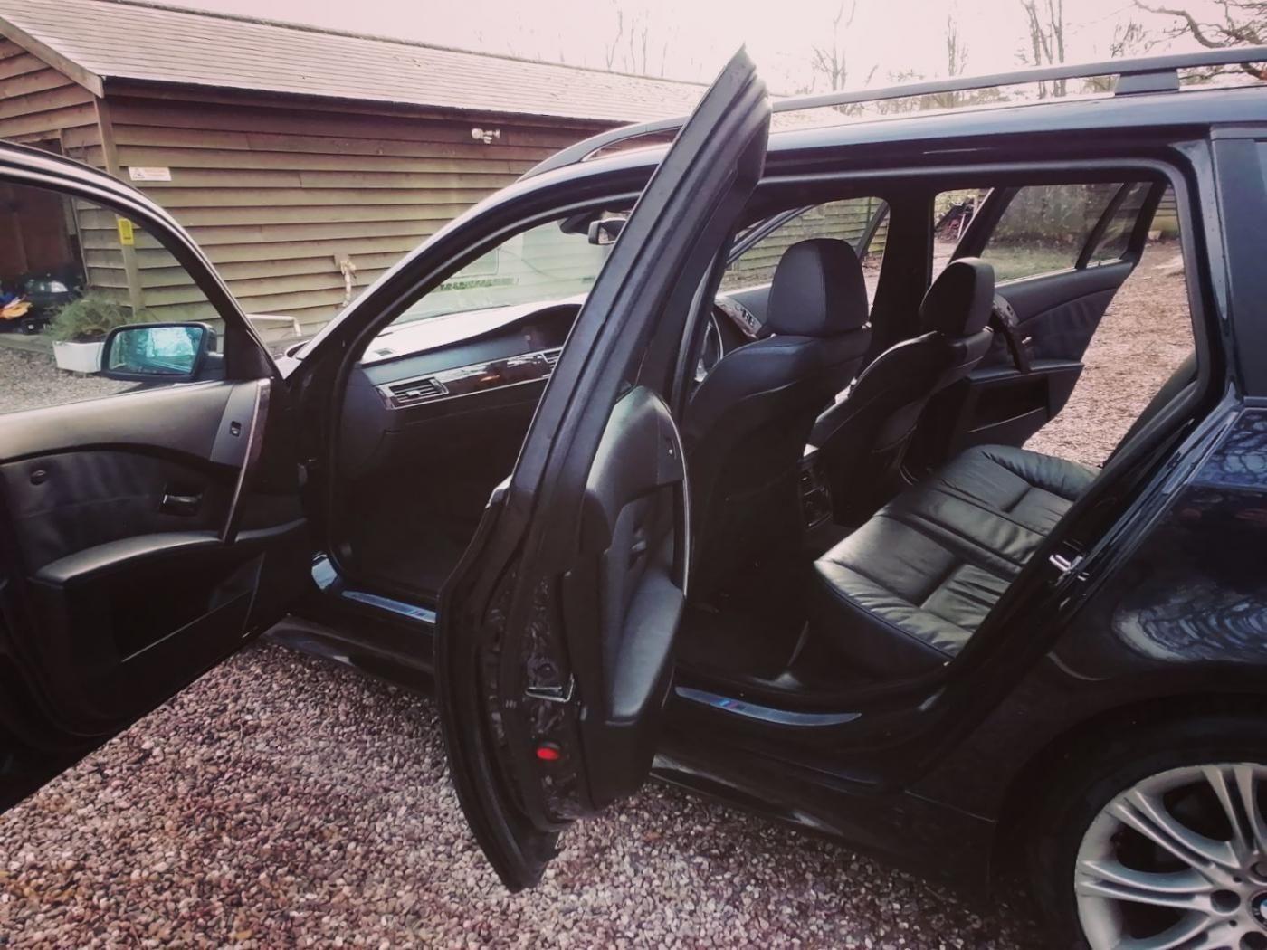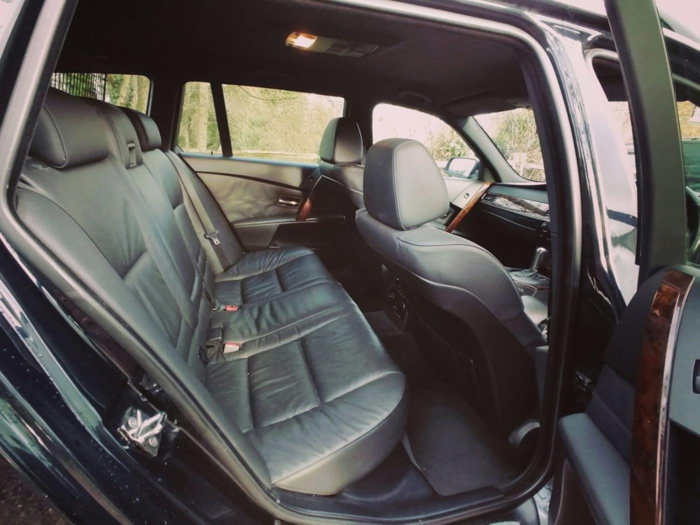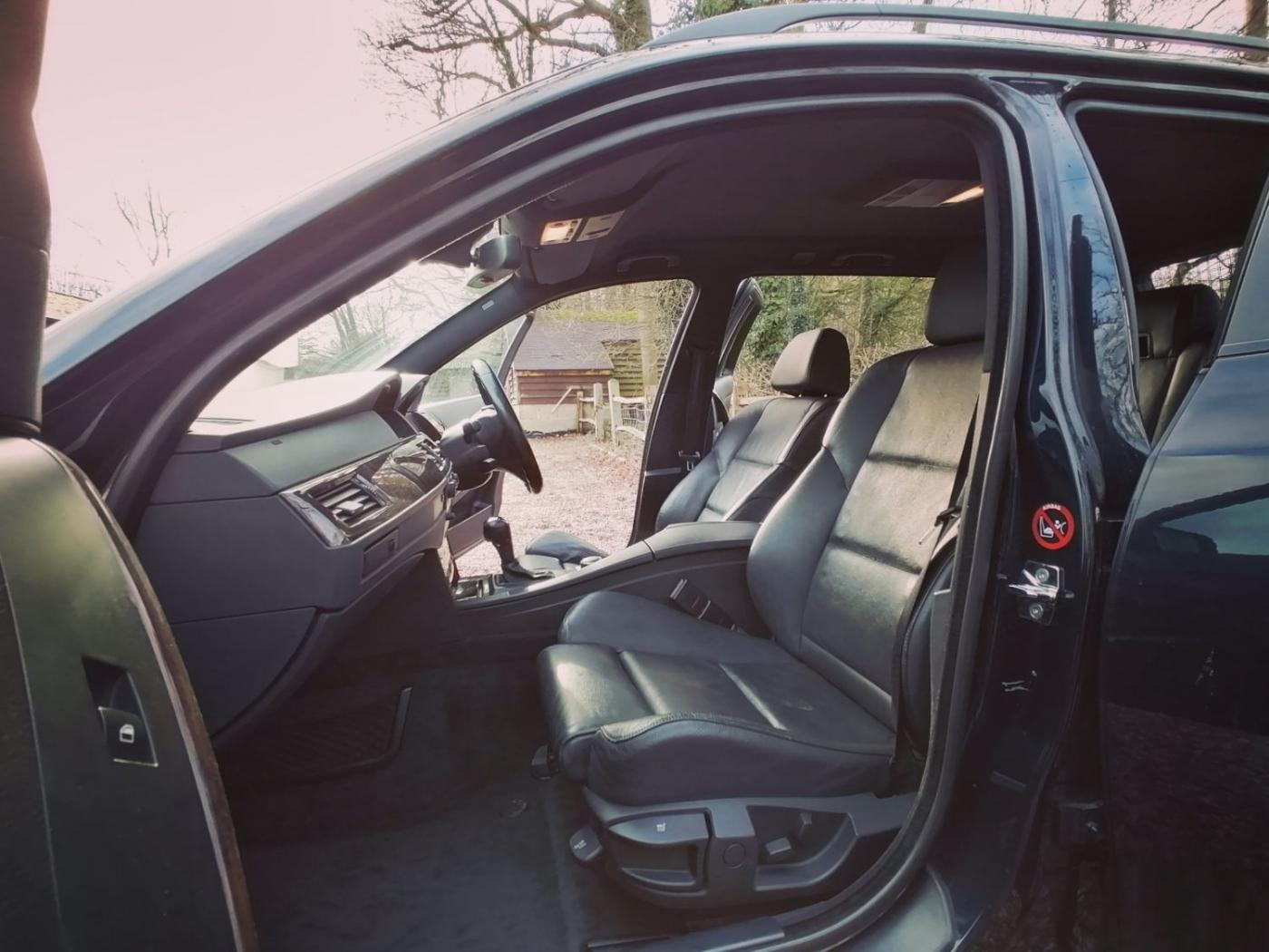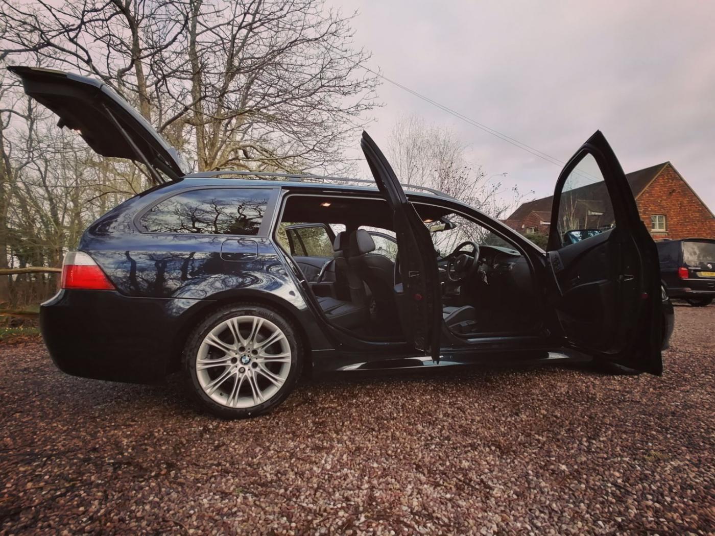 2006 BMW 530d M Sport Touring with the N57 turbo charged 3.0 6 cylinder engine and wonderfully smooth automatic gearbox. This diesel engine has covered 226507k miles (fantastic service history) and is wearing Carbon Black metallic paint on 18 inch M Sport alloy wheels. The interior is Dakota black leather with heated sports seats. The rear windows also have factory sun tints.