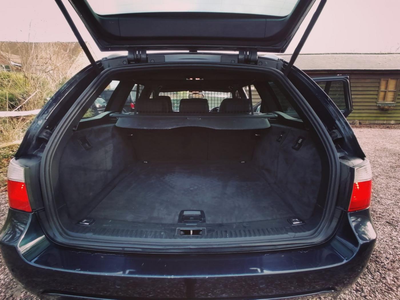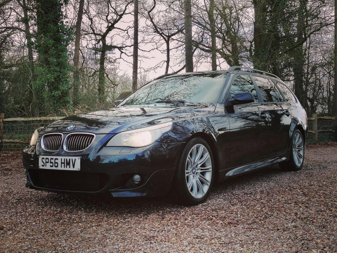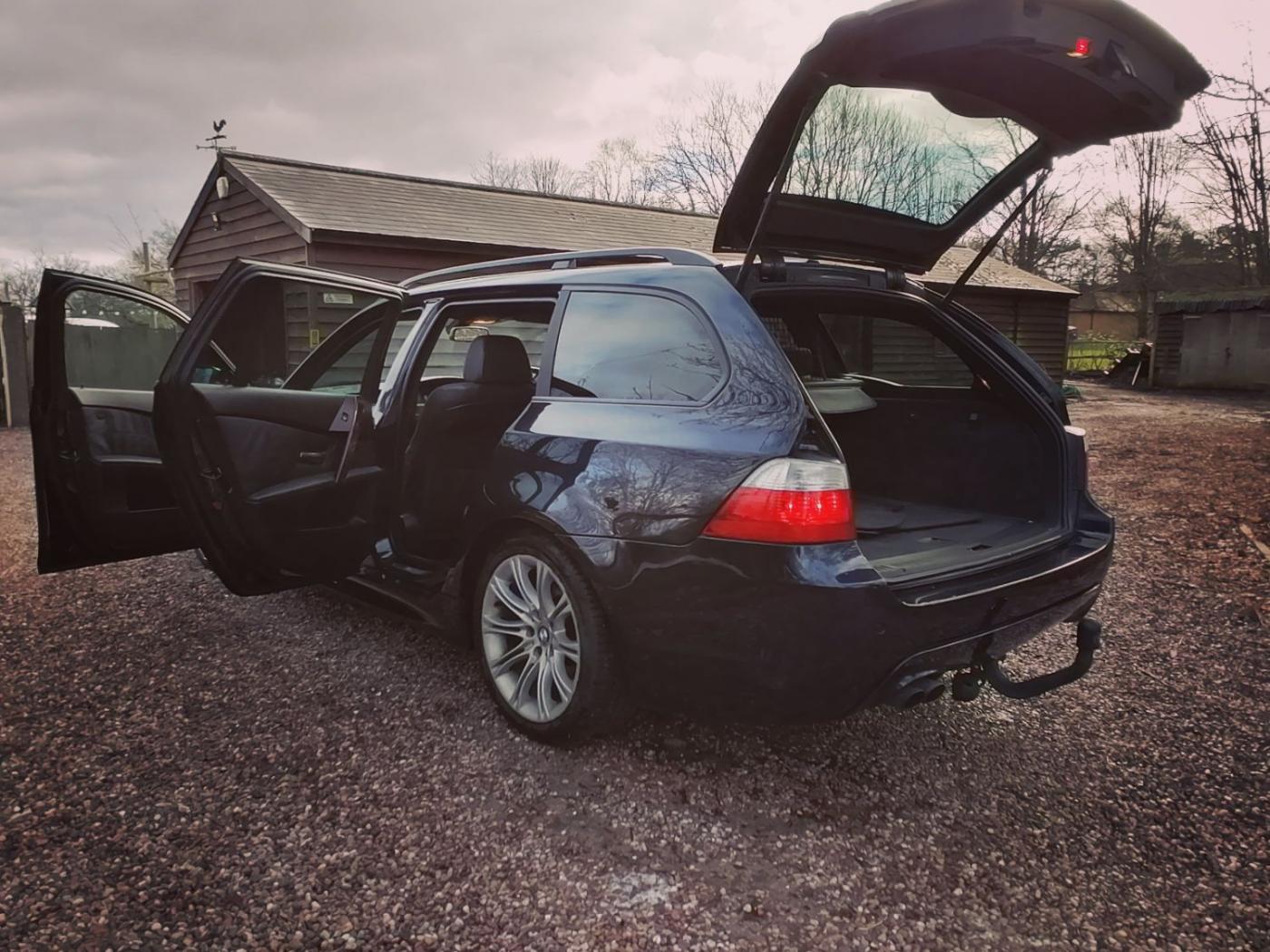 2006 BMW 530d M Sport Touring with the N57 turbo charged 3.0 6 cylinder engine and wonderfully smooth automatic gearbox. This diesel engine has covered 226507k miles (fantastic service history) and is wearing Carbon Black metallic paint on 18 inch M Sport alloy wheels. The interior is Dakota black leather with heated sports seats. The rear windows also have factory sun tints.