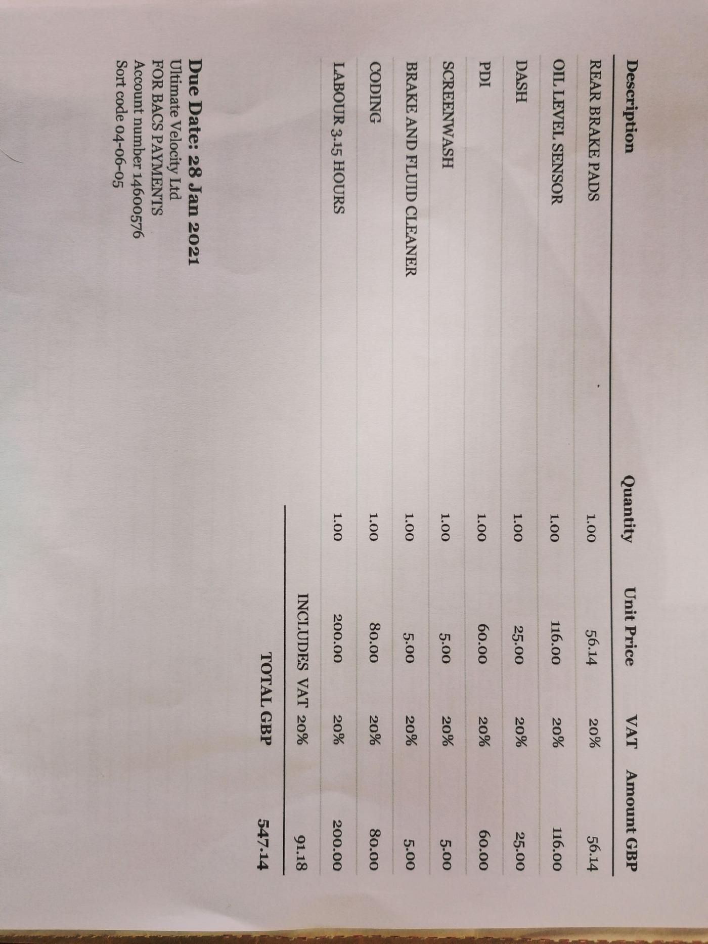 - 1 invoice for recent work carried out